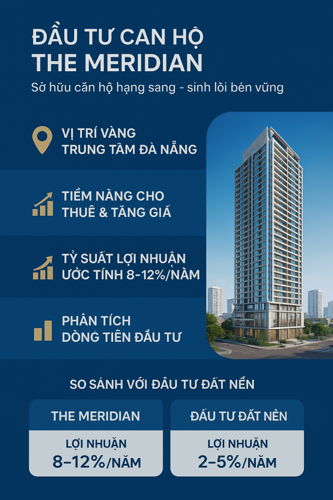 Từ góc nhìn chuyên gia với hơn 10 năm phân tích dòng vốn bất động sản miền Trung (Experience), tôi thấy The Meridian không chỉ là tài sản cố định mà còn là công cụ khai thác dòng tiền thụ động. Dự án nằm tại phường Hòa Cường Nam, quận Hải Châu, tận dụng lợi thế địa kinh tế: gần khu công nghệ cao Đà Nẵng (FPT City) và các trung tâm hội nghị quốc tế, thu hút chuyên gia nước ngoài và doanh nhân. Theo Ngân hàng Nhà nước Việt Nam, lãi suất huy động giảm còn 5-6%/năm, khiến bất động sản cho thuê trở thành lựa chọn thay thế hấp dẫn hơn trái phiếu hoặc tiết kiệm, với IRR (tỷ suất hoàn vốn nội bộ) dự kiến 10-15% sau 5 năm.