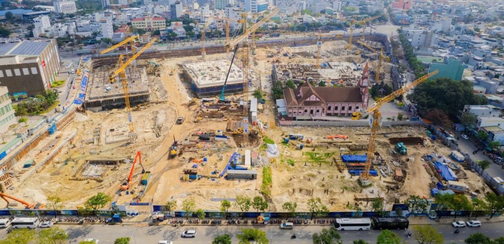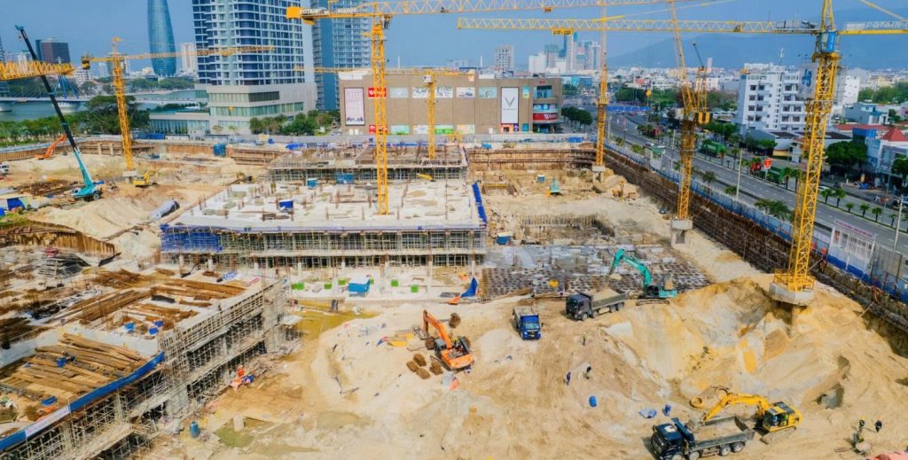 Vào tháng 2/2026, khi Đà Nẵng đang chào đón Xuân Bính Ngọ, tiến độ thi công được đẩy mạnh. Các hạng mục trọng điểm đang được triển khai đồng bộ, đảm bảo tiêu chuẩn kỹ thuật và an toàn lao động. Đội ngũ thi công từ BRG Group tập trung hoàn thiện các phần việc quan trọng, duy trì nhịp độ khẩn trương trước và sau kỳ nghỉ Tết. Theo cập nhật từ công trường, siêu cấu trúc của các tòa tháp đã bắt đầu từ tháng 11/2025, với mục tiêu hoàn thành level 5 vào quý I/2026. Ảnh flycam mới nhất cho thấy cần cẩu hoạt động không ngừng nghỉ, với bê tông được đổ liên tục cho các tầng thấp.